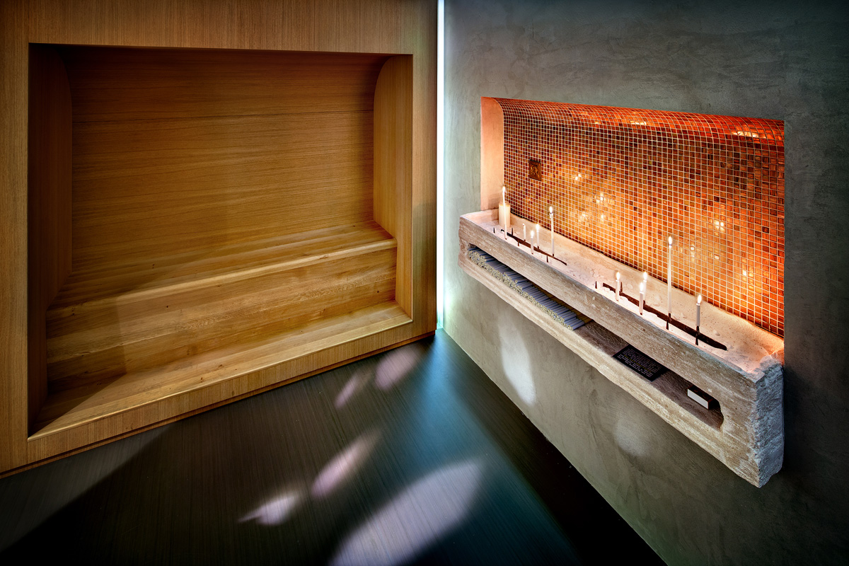 A beautiful design from Francesco Messori of D/Dock, the Stiltecentrum was designed as a place to reflect and feel safe. The benches have a soft curve that is nice to run your hand over. Sitting under the curved ceilings of the niches you feel as if you are sitting inside a tree. I enjoyed working out the final form of the prayer stool and the various reveals around the walls and arches.